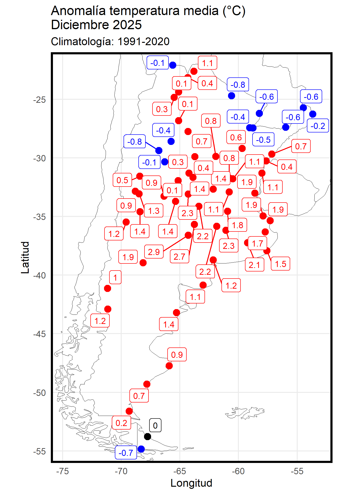 Anomalía de la temperatura mínima media y máxima media mensual al norte de los 40°S desde el año 1971, siguiendo la metodología descripta en este posteo.